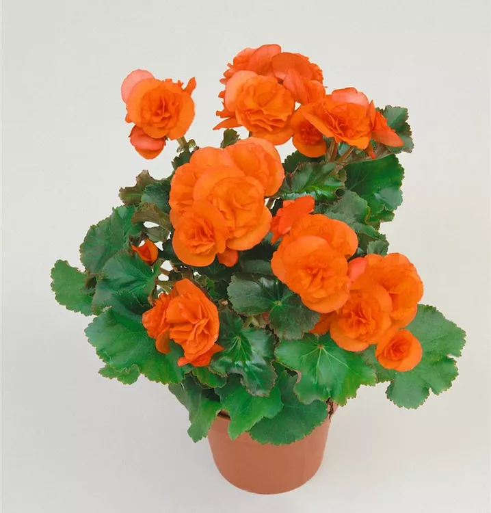 Die Begonie (Begonia elatior) ist eine orange blühende Pflanze, die dreieckige, gesägte Blätter trägt. Ihre schalenförmigen Blüten erscheinen von April bis September. Diese kompakte Pflanze gedeiht am besten an einem sonnigen bis halbschattigen Standort.