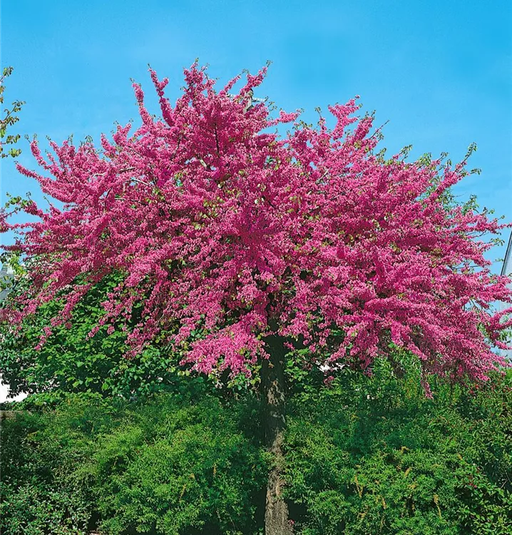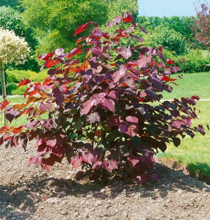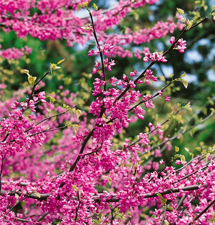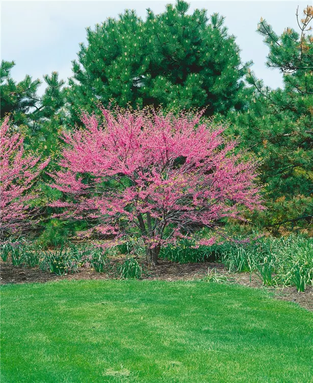 Der Kanadische Judasbaum (Cercis canadensis) ein ausladender, malerischer Großstrauch, der, je nach Sorte, schmetterlingsförmige Blüten in verschiedenen Farben hervorbringt. An einem sonnigen Standort mit durchlässigem, kalkhaltigem Boden erreicht er gewöhnlich eine Höhe von ca. 10 m und wird ca. 8 m breit.