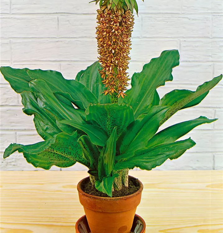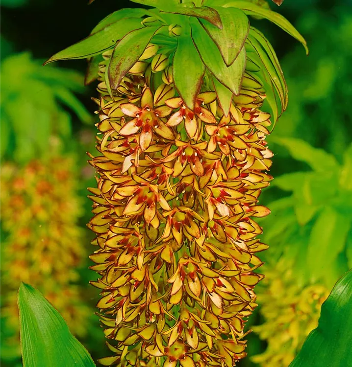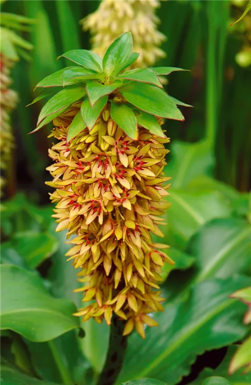 Die Schopflilie (Eucomis bicolor) bringt ansehnliche, gelbe, leicht duftende Blüten von Juli bis August hervor. Bevorzugt wird ein durchlässiger, humoser Boden in sonniger Lage. Die aufrechte Staude erreicht gewöhnlich eine Höhe von 60 - 80 cm und wird bis zu 50 cm breit.