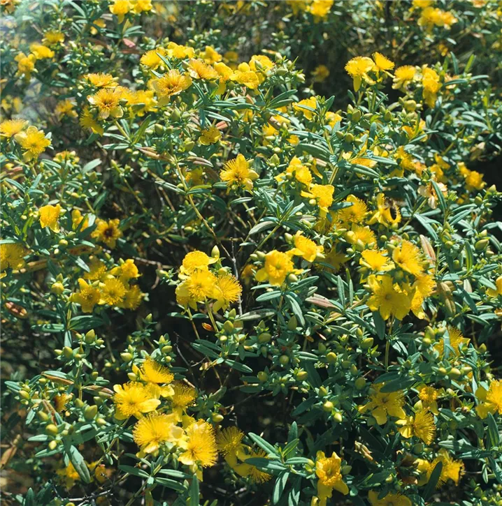 Dünen-Johanniskraut ist ein breit wachsender Kleinstrauch. Es erreicht gewöhnlich eine Höhe von 0,6 - 1 m und wird ca. 0,8 - 1,2 m breit.