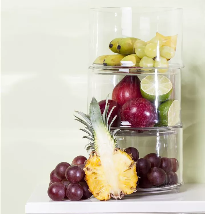 Die Essbanane (Musa acuminata) bildet gelbe Früchte. Sie sind länglich und haben einen süßen, milden Geschmack. Für eine ertragreiche Ernte ab Oktober schaffen durchlässiger, humoser, nährstoffreicher Boden und ein heller Standort optimale Bedingungen. Auch ihre rosafarbenen, dunkelroten Blüten sind eine schöne Erscheinung.