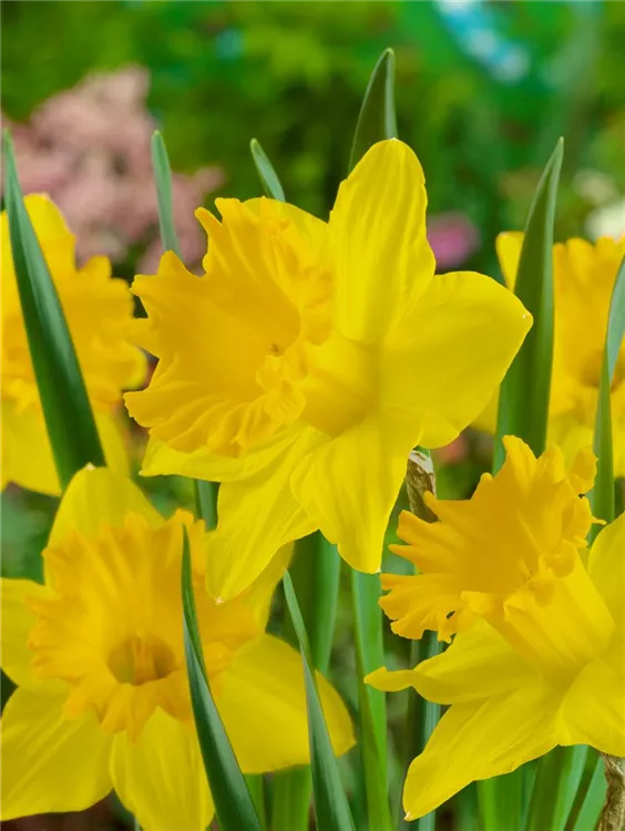 Die gelben, radförmigen oder röhrenförmigen Blüten der Narzisse 'Braga' erscheinen in Trauben im April. Diese sind angenehm duftend.