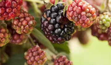 Die Brombeere (Rubus fruticosus) bildet schwarze Beeren. Diese sind aromatisch, fruchtig im Geschmack. Für eine ertragreiche Ernte ab August schaffen durchlässiger, humoser, nährstoffreicher Boden und ein sonniger bis schattiger Standort optimale Bedingungen. Auch ihre weißen Blüten sind eine schöne Erscheinung.