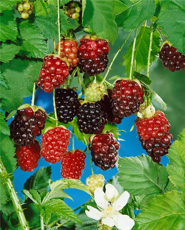 Die Schwarze Himbeere 'Bristol' (Rubus idaeus) bildet schwarze, sehr große Beeren. Diese sind fest und süß, mild im Geschmack. Für eine ertragreiche Ernte ab Juli schaffen durchlässiger, nährstoffreicher Boden und ein sonniger bis halbschattiger Standort optimale Bedingungen. Auch ihre weißen Blüten sind eine schöne Erscheinung.