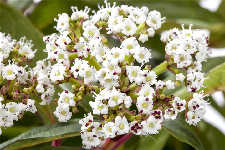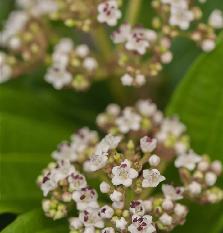 Die hellrosafarbenen Blüten des Immergrünen Kissenschneeball erscheinen in Trugdolden im Juni. Diese sind stark duftend.