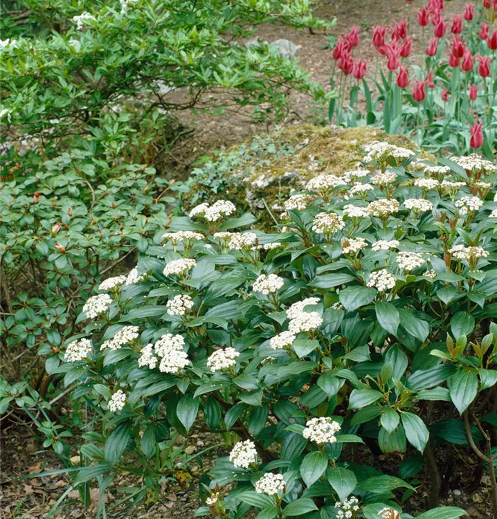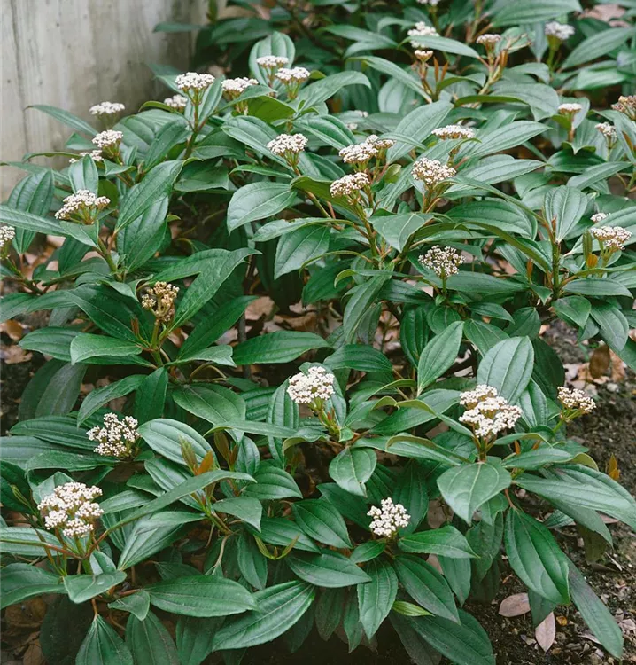 Der Immergrüne Kissenschneeball (Viburnum davidii) ist ein kissenförmiger Kleinstrauch mit dekorativen, dunkelblauen, ovalen Früchten. Die Blüten erscheinen je nach Sorte in verschiedenen Farben.Zudem trägt der Immergrüne Kissenschneeball dekorative, immergrüne, ledrige, lanzettliche, dunkelgrüne Blätter.