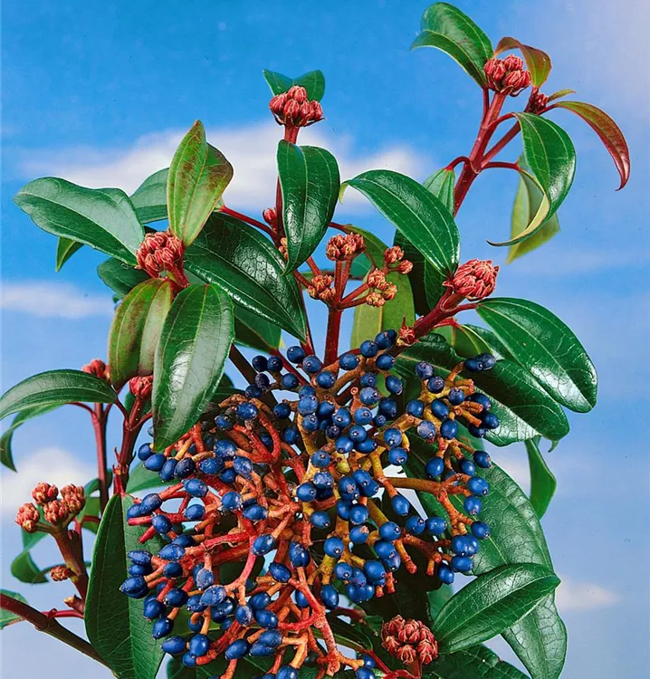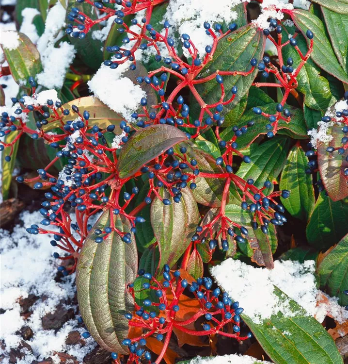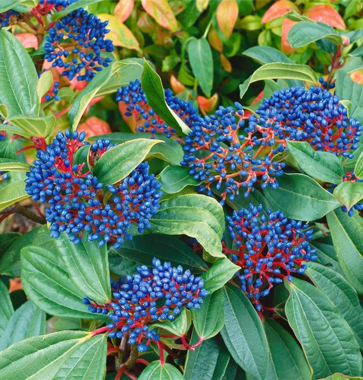 Besonders dekorativ sind die dunkelblauen, ovalen Steinfrüchte von Viburnum davidii. Diese erscheinen ab September.