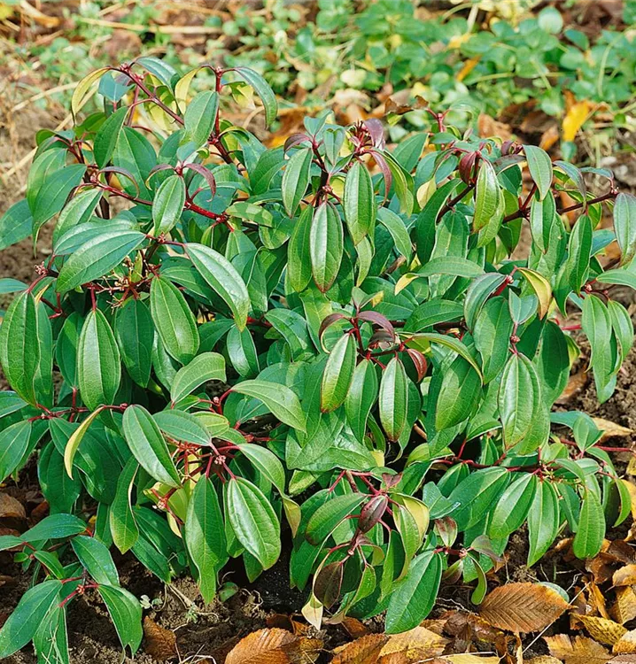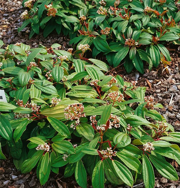 Hoher Blattschmuckwert. Die immergrünen Blätter des Immergrünen Kissenschneeballs sind dunkelgrün, lanzettlich, ledrig, gegenständig. Diese sind etwa 7 - 15 cm groß.
