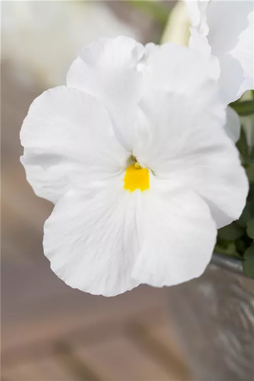 Das Garten-Stiefmütterchen, weiß (Viola x wittrockiana) ist eine beliebte Pflanze für den Balkon, die während der gesamten Saison unzählige weiße Blüten bildet. Ein halbschattiger bis schattiger Standort und ein durchlässiges Substrat werden bevorzugt.