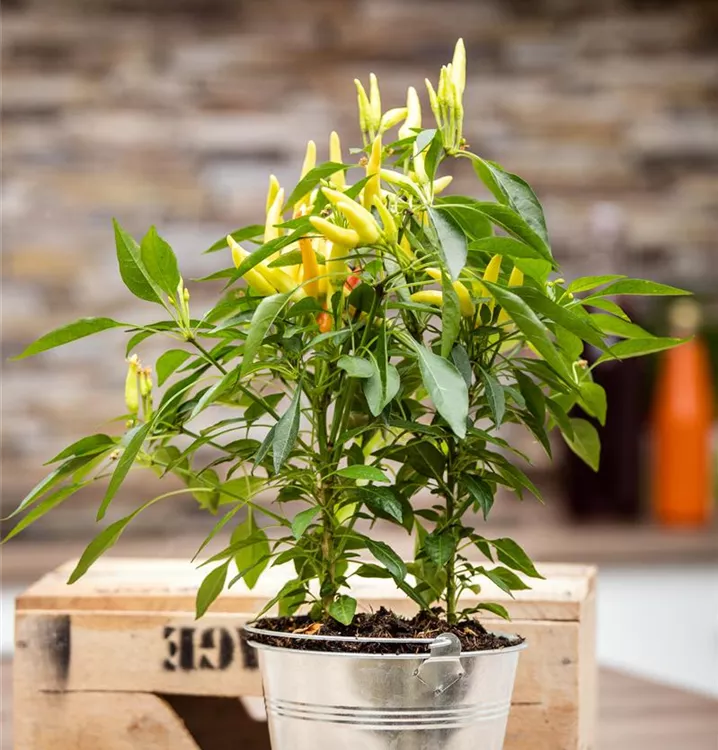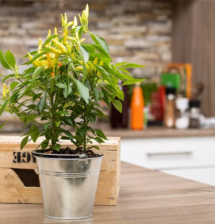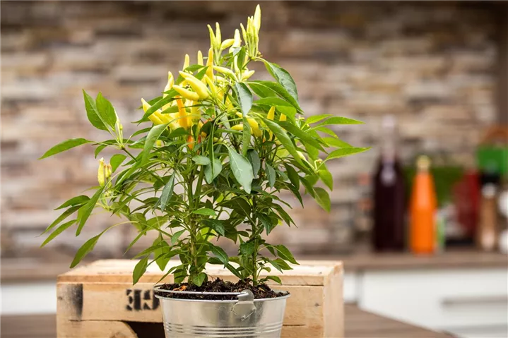 Die Mini-Chili 'Paprikanos' (Capsicum annuum) bildet Früchte, die aromatisch, mild schmecken und bereits ab Juli geerntet werden können. Für das optimale Wachstum der Mini-Chili 'Paprikanos' werden ein sonniger Standort und durchlässiger, nährstoffreicher Boden benötigt.