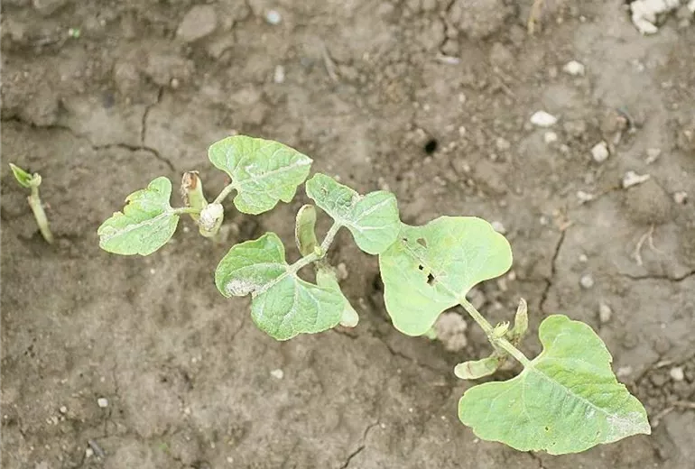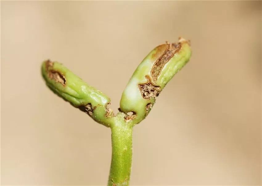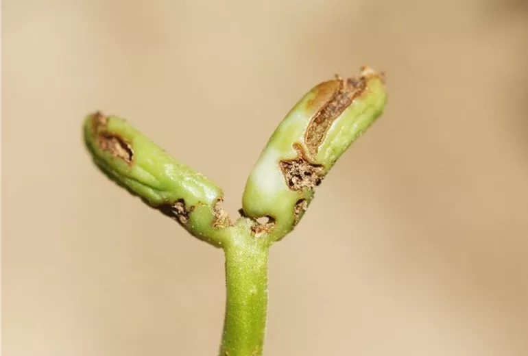 Die jungen Bohnenkeimlinge gehen kurz nach Entfalten der häufig beschädigten Keimblätter ein. Nicht selten laufen die Bohnensamen erst gar nicht auf.
