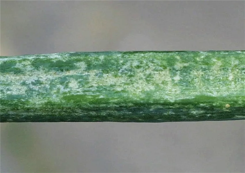 An Zwiebelblättern zeigen sich im Sommer in Längsrichtung des Laubes streifig verlaufende silbrig graue Flecken. Bei genauer Betrachtung ist erkennbar, dass diese Flecken aus einer Unmenge winzig feiner Einstiche zusammengesetzt sind.