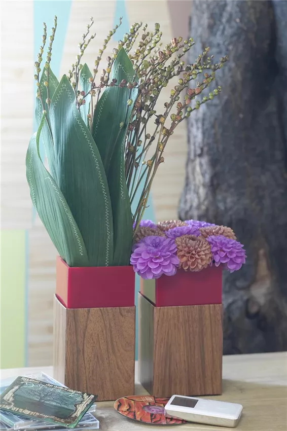 - Entscheiden Sie sich erst für das Gefäß und suchen Sie sich dann passend zu Form und Farbe die Blumen aus