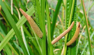 Der Kolbenblütige Kalmus (Acorus calamus) ist mit seinen mittelgrünen Blättern eine ausgesprochen dekorative Wasserpflanze, die für solche Einsatzbereiche wie Teichrand, Bachlauf, Kübel und Teich besonders gut geeignet ist. Die Blüten erscheinen, je nach Sorte, in vielen Farben von Juni bis Juli. Er bevorzugt nährstoffreichen Boden in sonniger bis halbschattiger Lage. Der Kolbenblütige Kalmus ist gut frostverträglich. Die aufrechte, ausläuferbildende Staude erreicht gewöhnlich eine Höhe von ca. 80 cm.