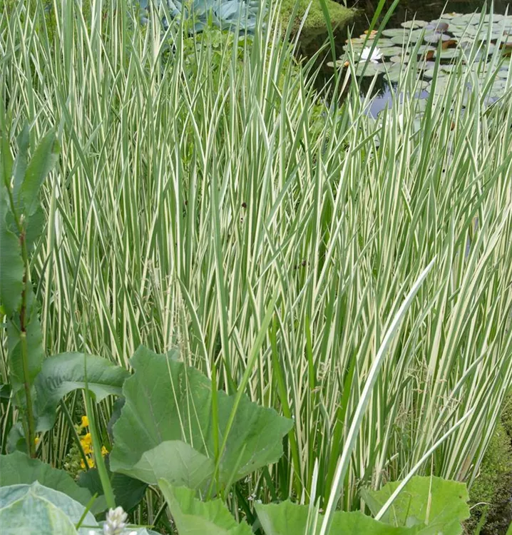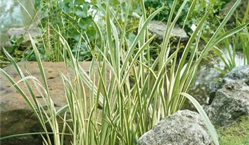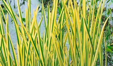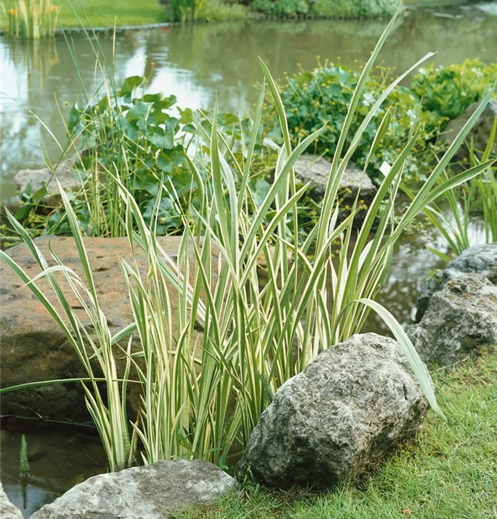Der Weißgestreifte Garten-Kalmus 'Variegatus' (Acorus calamus) ist mit seinen mittelgrünen Blättern mit cremeweißer Umrandung eine ausgesprochen dekorative Wasserpflanze, die für solche Einsatzbereiche wie Teichrand, Bachlauf, Kübel und Teich besonders gut geeignet ist. Grüngelbe Blüten erscheinen von Juni bis Juli. Er bevorzugt nährstoffreichen Boden in sonniger bis halbschattiger Lage. Der Weißgestreifte Garten-Kalmus 'Variegatus' ist gut frostverträglich. Die aufrechte, ausläuferbildende Staude erreicht gewöhnlich eine Höhe von ca. 80 cm.