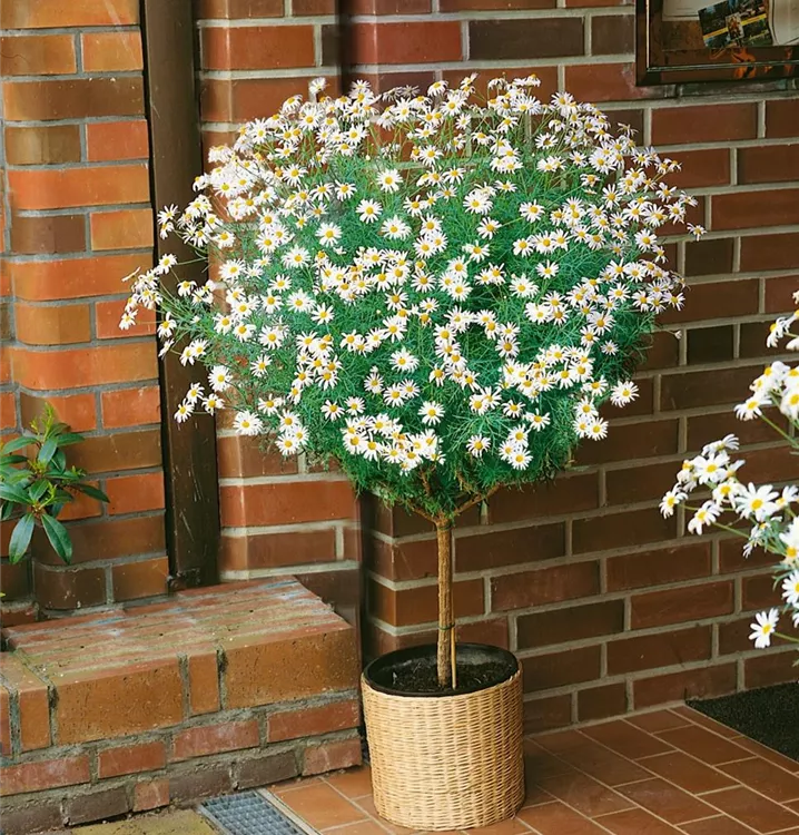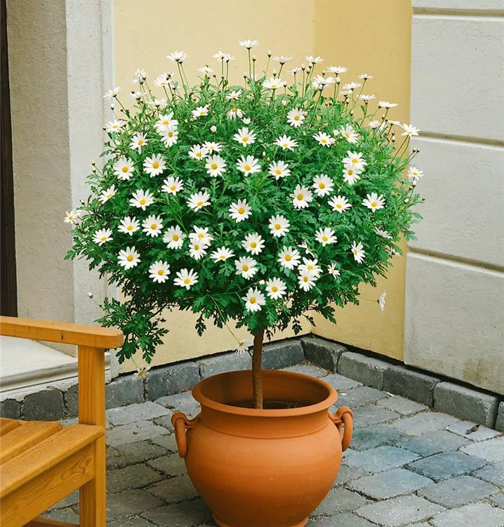 Die Strauchmargerite (Argyranthemum frutescens) ist eine beliebte Pflanze für den Balkon, die während der gesamten Saison unzählige weiße, gelbe, rosafarbene Blüten bildet. Die mittelgrünen Blätter sind lanzettlich. Ein sonniger Standort und ein durchlässiges Substrat werden bevorzugt.