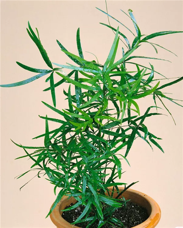 Die Blätter des Zier-Spargels sind mittelgrün, lanzettlich.