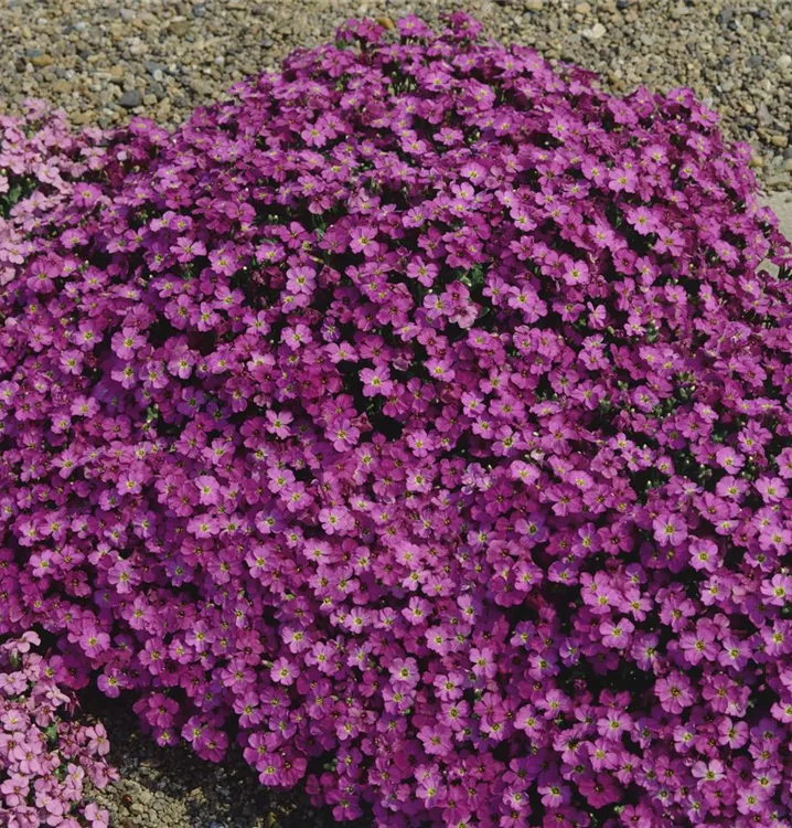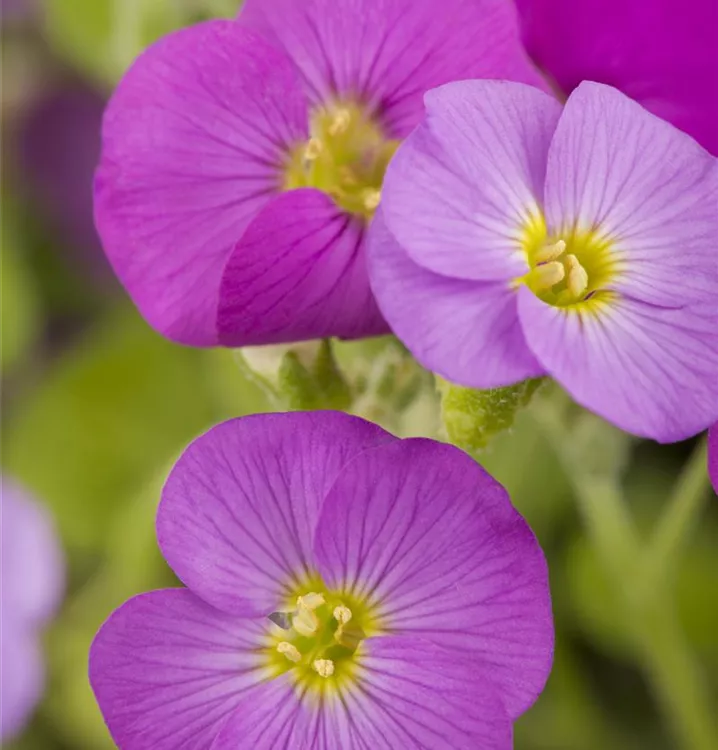 Aubrieta deltoidea bildet radförmige, lilafarbene Blüten ab April.