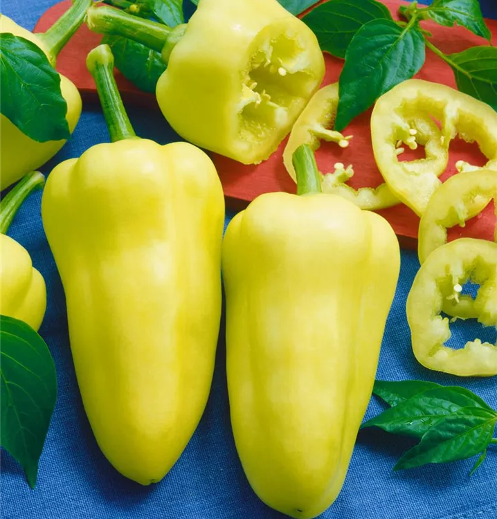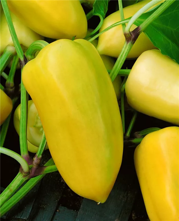 Die Paprika 'Feher' (Capsicum annuum) bildet Früchte, die aromatisch schmecken und bereits ab Juli geerntet werden können. Für das optimale Wachstum der Paprika 'Feher' werden ein sonniger Standort und durchlässiger, nährstoffreicher Boden benötigt.