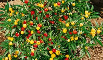Die leuchtend roten Früchte haben einen scharfen Geschmack. Die Früchte sind schotenförmig.