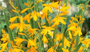 Die Bastard-Montbretie (Crocosmia x crocosmiiflora) blüht über Monate hinweg. Je nach Sorte, erscheinen die dekorativen Blüten in den Farben Gelb und Orange. Bevorzugt wird ein sonniger Standort und eine durchlässige Erde.