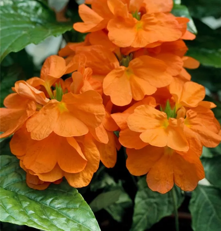 Die Crossandra (Crossandra infundibuliformis) ist eine orange blühende Pflanze, die lanzettliche, dunkelgrüne, glänzende, glänzende, gewellte Blätter trägt. Ihre tellerförmigen Blüten erscheinen in Ähren von April bis Oktober. Diese aufrechte und buschige Pflanze gedeiht am besten an einem sonnigen bis halbschattigen Standort.