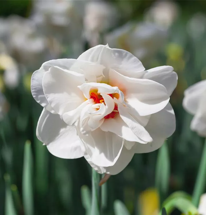 Die Narzisse (Narcissus) blüht über Monate hinweg. Je nach Sorte, erscheinen die dekorativen Blüten in den Farben Weiß, Gelb und Orange. Bevorzugt wird ein sonniger Standort und eine durchlässige Erde.