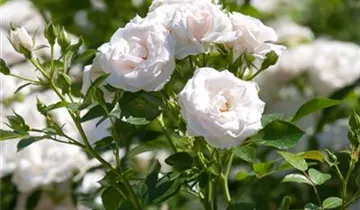 Die Beetrose 'Aspirin-Rose'<sup>®</sup> (Rosa) ist eine reichblühende Rose, die im Garten eine besondere Rolle spielt. Die zahlreichen gefüllten Blüten sind weiß und erscheinen von Juni bis September. Ihr wunderbarer Duft entfaltet sich besonders an sonnigen, warmen Tagen. Mit den richtigen Begleitern an ihrer Seite, kommt die Königin der Blumen besonders gut zur Geltung. Niedrige Stauden, Lavendel und Salbei eignen sich ganz gut für diese Zwecke.