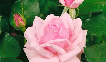 Die Edelrose 'Savoy Hotel'<sup>®</sup> (Rosa) ist eine reichblühende Rose, die im Garten eine besondere Rolle spielt. Die gefüllten Blüten sind rosa und erscheinen zahlreich von Juni bis Oktober. Mit den richtigen Begleitern an ihrer Seite, kommt die Königin der Blumen besonders gut zur Geltung. Niedrige Stauden, Lavendel und Salbei eignen sich ganz gut für diese Zwecke.