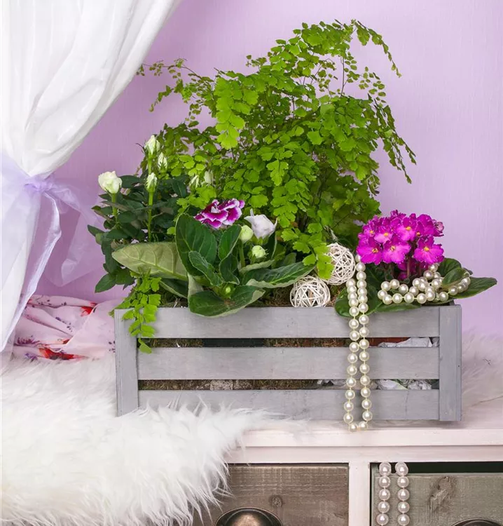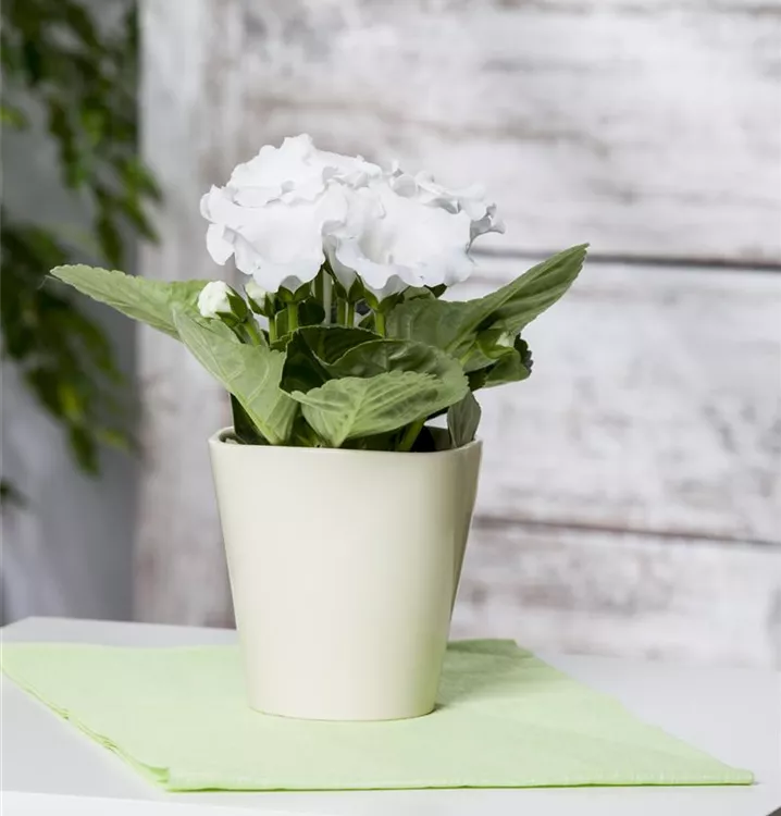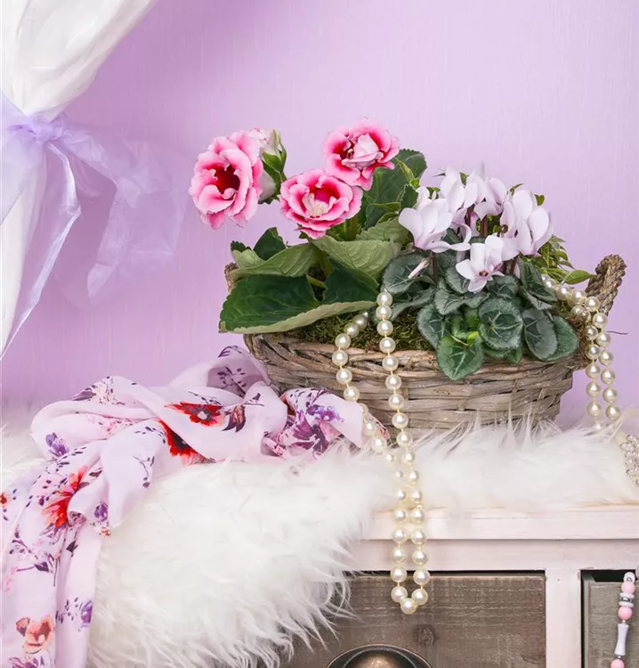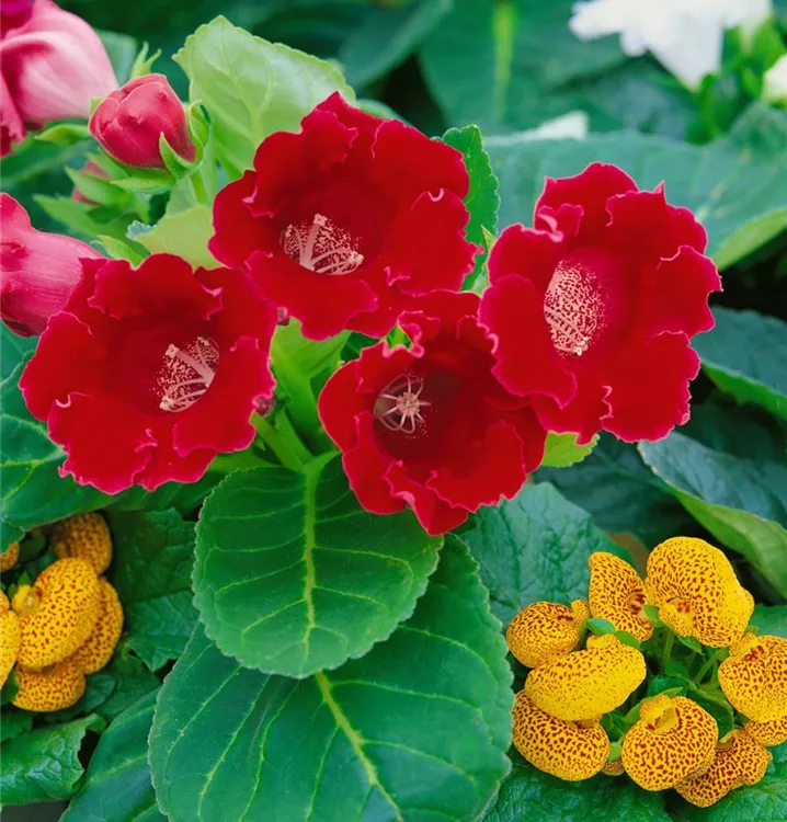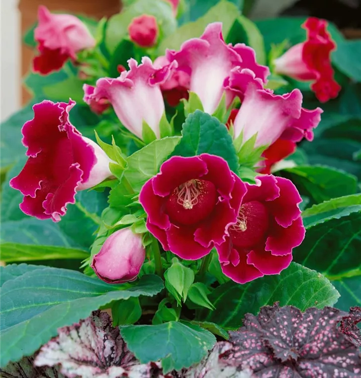 Die Falsche Gloxinie (Sinningia speciosa) blüht über Monate hinweg. Je nach Sorte, erscheinen die dekorativen Blüten in den Farben Rosa, Rot, Violett und Zweifarbig. Die matten, eiförmigen Blätter sind gekerbt. Bevorzugt wird ein heller Standort und eine durchlässige Erde.
